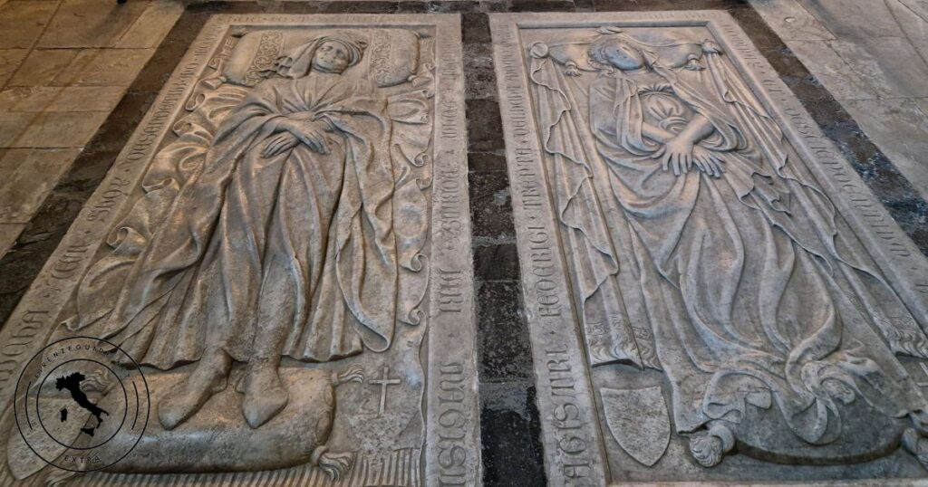 このように床面にはめ込まれた墓石に人が横たわった姿を象ったものは教会の床に時々ありますが、これはこのお墓の持ち主の生前の姿に似せて作られていることが多いです。